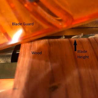 Adjust the blade height on the table saw and cut a 3" x 1" piece of hard wood. The blade should extend slightly above the height of the wood.